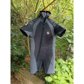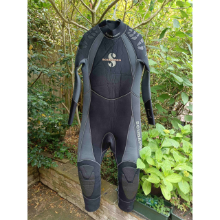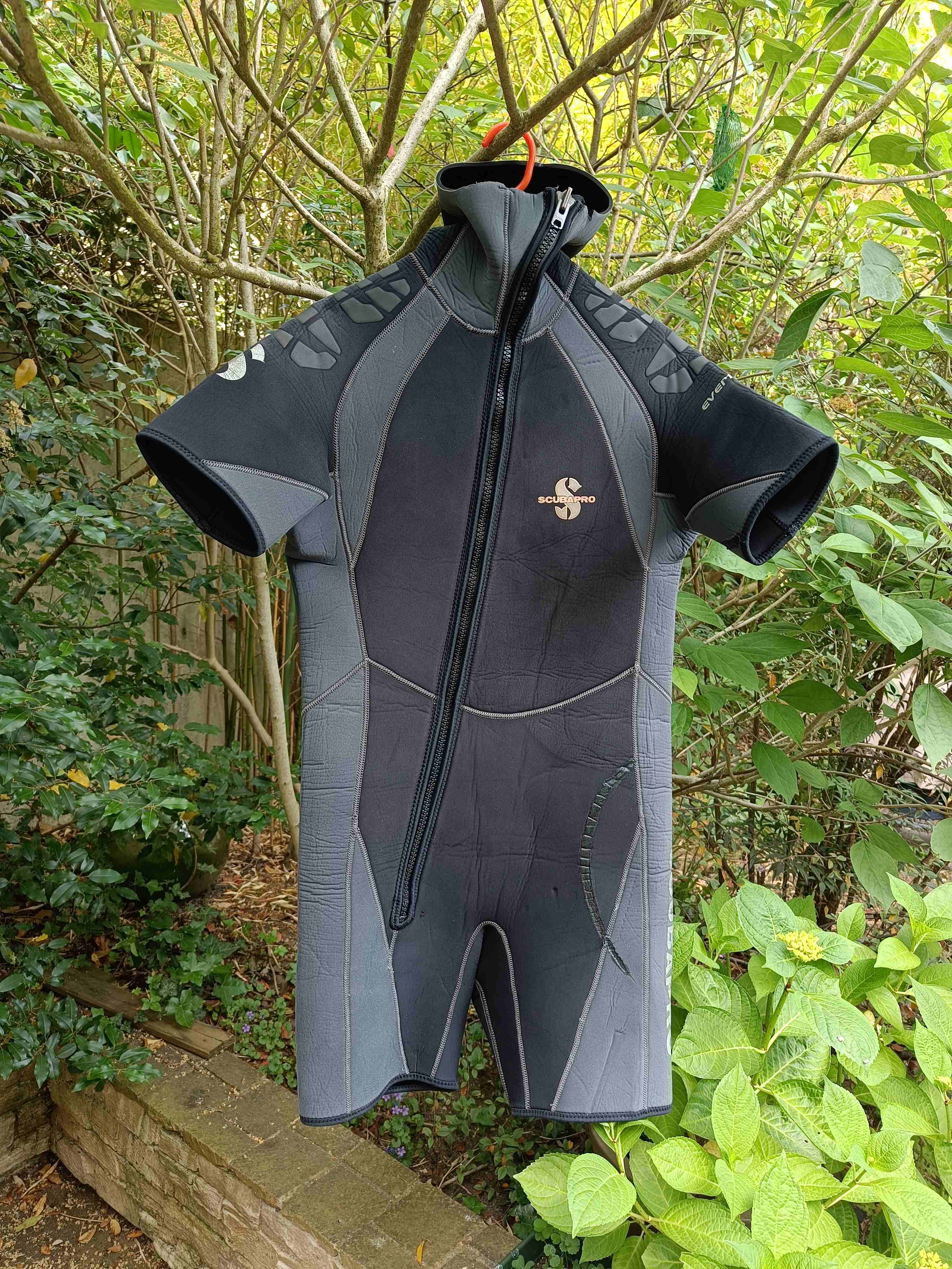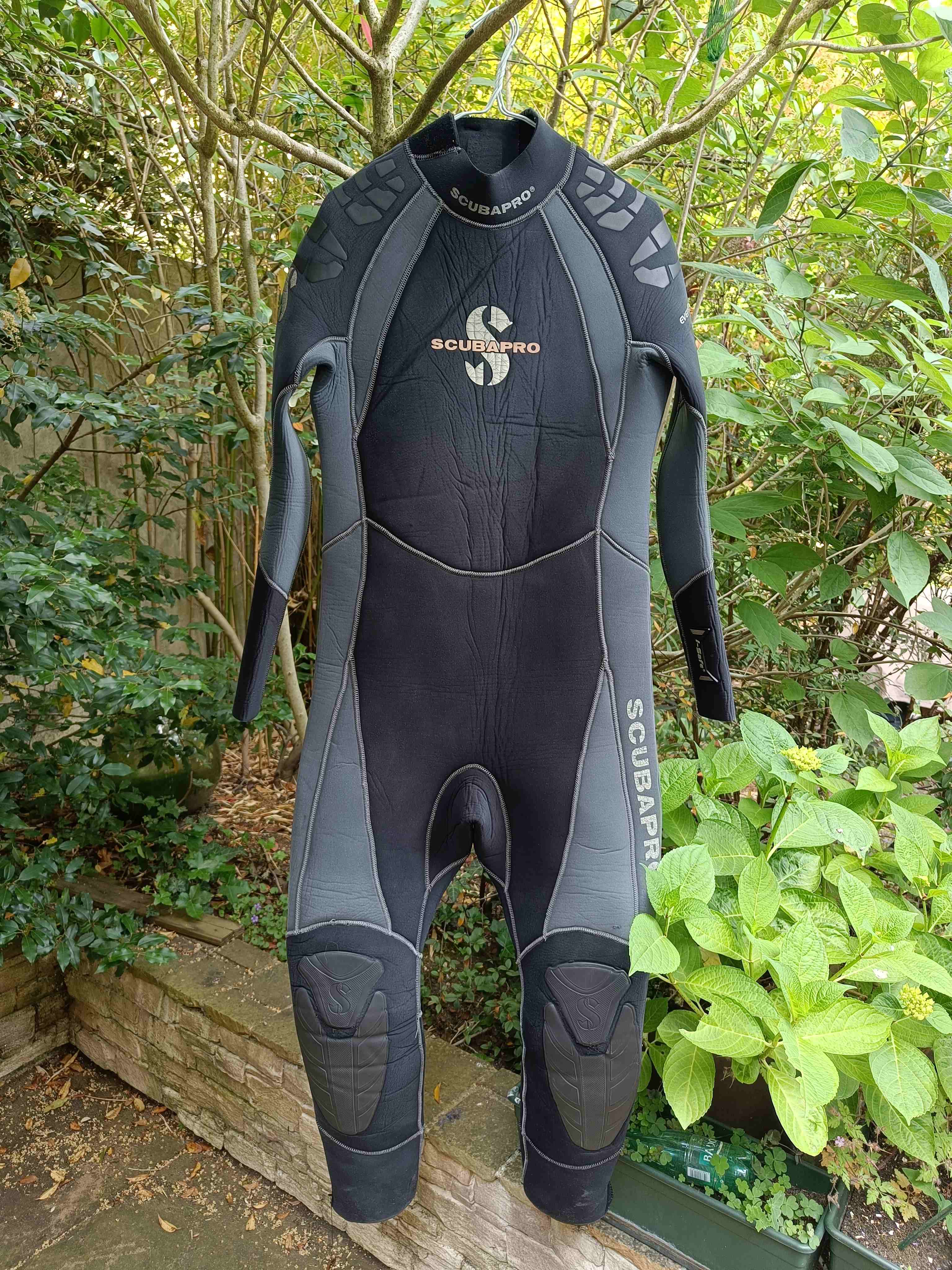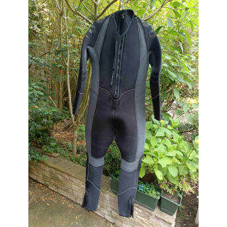 Comprend une combinaison avec manchons aux poignets et aux chevilles, fermetures en plus aux chevilles, fermeture éclair de la combinaison en dorsal, Cagoule neuve attenante pour combinaison, surveste à cagoule avec fermeture ventrale. Ensemble pour plongée eaux fraiches "Atlantique", mais séparément peut servir en Méditerranée. Bon état général
