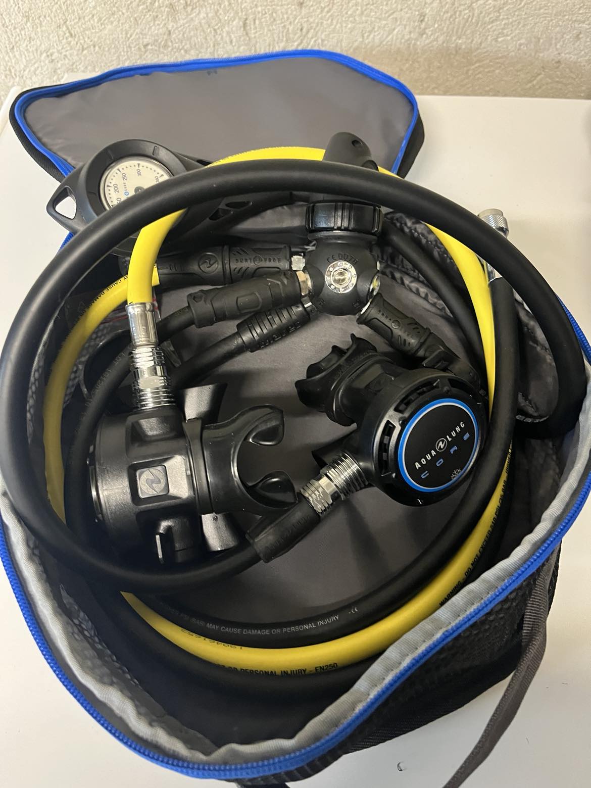 vente d'un détendeur Aqua lung DIN équipé d'un 2e étage Core + , d'un 2e étage Core (octopus) et d'un manomètre . Le tout vendu avec le sac de rangement.